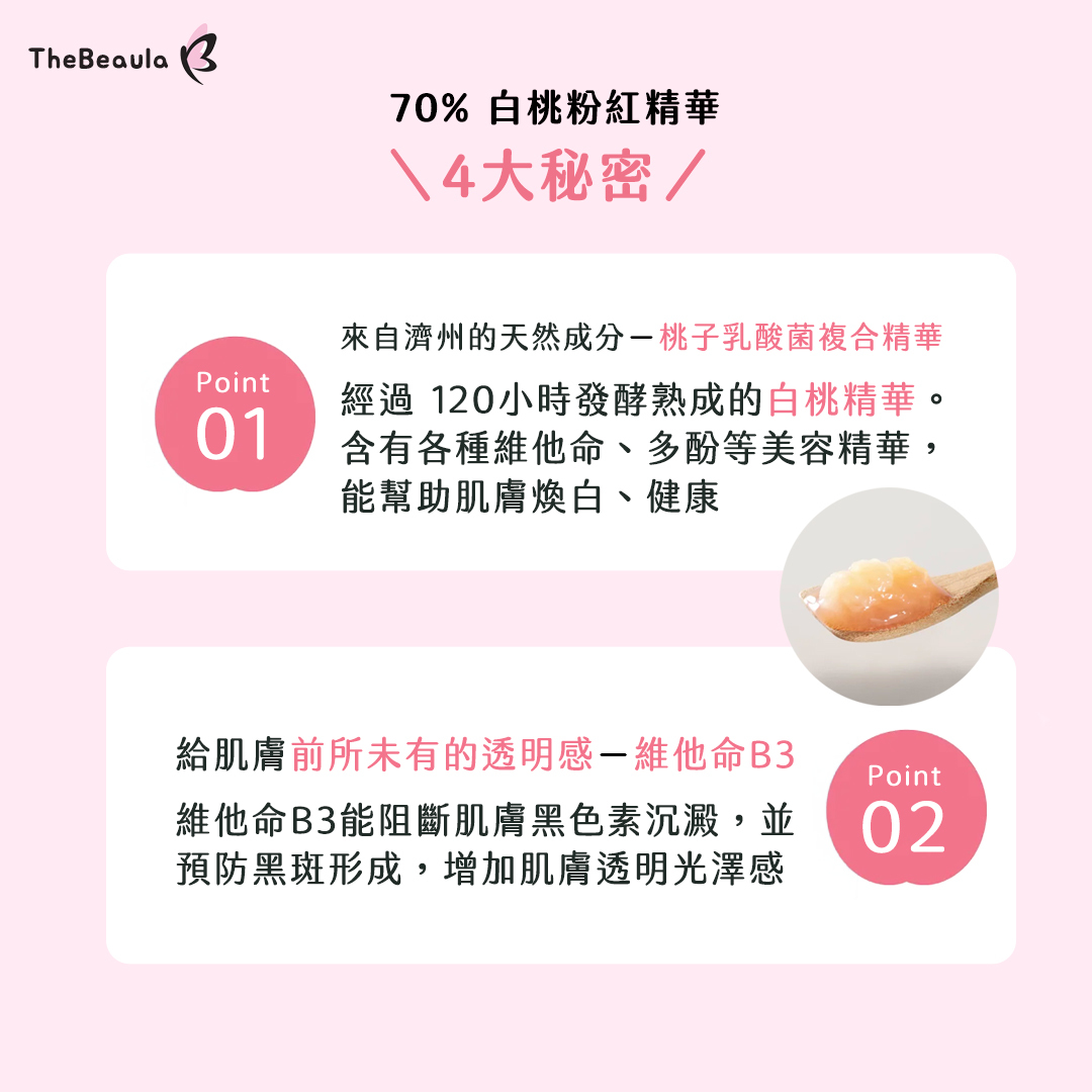 ・桃子精華萃取 :自濟州島的桃子中萃取,70% 是由桃子萃取出來的,幫助肌膚美白、健康