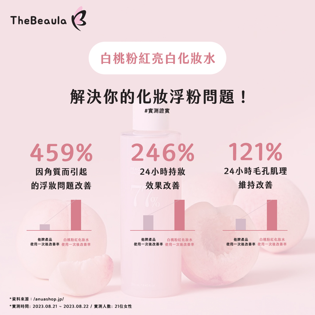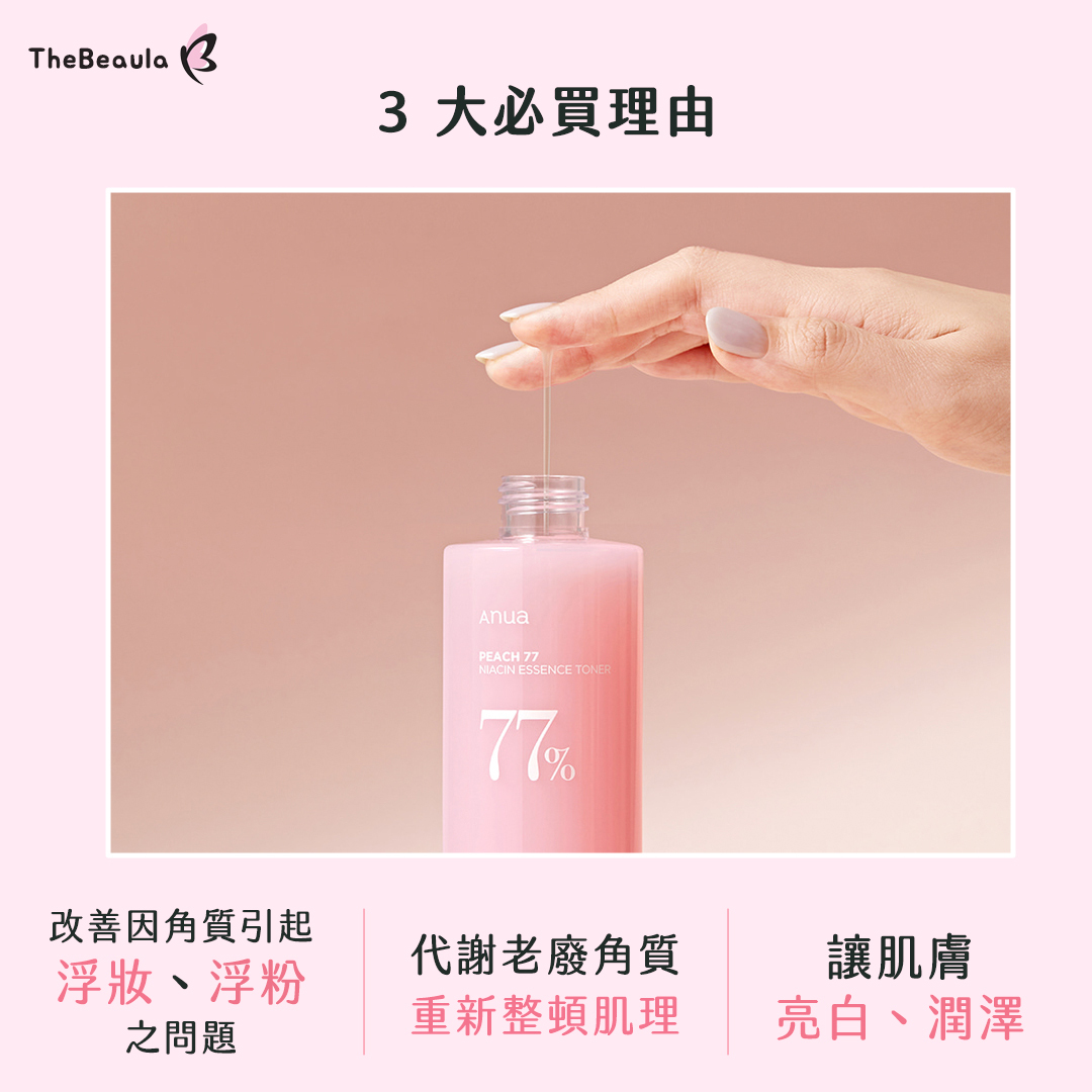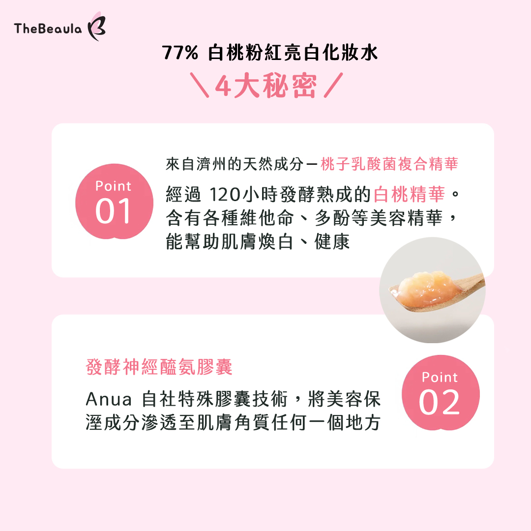 Anua 白桃化妝水富含 77% 的白桃萃取,結合煙醯胺(維他命 B3),能有效提亮膚色,改善暗沉,讓肌膚恢復明亮光彩。質地清爽,易於吸收,適合各種膚質,特別是希望提升肌膚透明度的使用者。